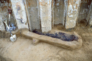 伝福寺裏遺跡の最大の特徴は、多くの植物遺存体が出土したことです。もちろん丸木舟もその一つになりますが、その他にも木製の杭や板材などの加工木、自然木、木の葉や果実、種子などが見つかっています。こうした植物遺存体など有機質の自然遺物が遺跡から出土することはあまり多くありません。しかし、伝福寺裏遺跡は低地に立地し、泥炭化した層を含む水分量が多い土壌中で、酸素が少ない状態にあったため、腐ることなく保存されていたのです。