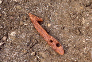 このような遺跡に遺る自然遺物は、当時の自然環境や人々の暮らしぶりを考えるための手がかりとなります。伝福寺裏遺跡では、検出された木材や種子から、縄文時代前期末から中期初頭(約5,000年前)の遺跡周辺には、スダジイが優先する照葉樹林が成立していたと考えられています。また、出土している遺物組成からは、漁獲物の解体や漁撈具の製作・修理などを行っていた作業空間だったのではないかとされています。
