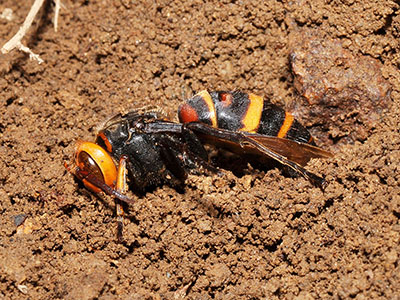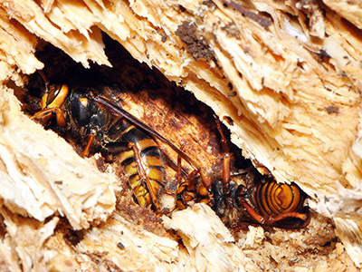 交尾を終えた雄バチはすぐに死にます。新女王バチは体内に雄の精子を貯めたまま、巣を離れて冬ごしの場所を探します。三浦半島でも冬に山林で越冬するスズメバチ類を見つけることができます。博物館の調査では、朽ち木の中からコガタスズメバチ(図1)やキイロスズメバチ(図2)を、崖斜面の地中からヒメスズメバチ(図3)を確認しています。直接確認できていませんが、オオスズメバチやクロスズメバチも山林の地中で冬を越します。なお、チャイロスズメバチ(図4)は三浦半島に分布を広げて間もないため、冬を三浦半島で過ごせるのかどうか、まだ分かっていません。