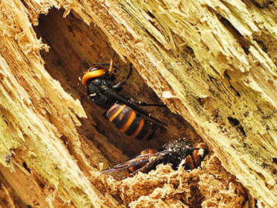 夏から秋にかけて巣が大きくなり、ときには近づいたヒトを襲うこともあるスズメバチたち。庭木の枝や家の軒下など目につきやすいところにつくるキイロスズメバチやコガタスズメバチが有名ですが、三浦半島ではその他にオオスズメバチ、ヒメスズメバチ、モンスズメバチ、チャイロスズメバチ、クロスズメバチを加えた7種が知られています。