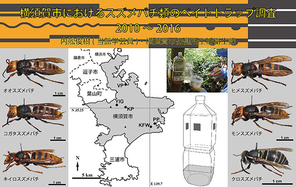 博物館では2010年から横須賀市内でトラップを用いたスズメバチ類の捕獲調査を、横須賀市保健所との共同研究によって行っています(図5)。おもに冬ごしから目覚めた女王バチの活動をトラップで捕獲した時期と個体数によって把握しています。この調査の目標の一つは、春先のスズメバチ類の捕獲数からその年の夏~秋の発生規模を予測することです。「今年は多くなりそうだからご注意を!」...そんなスズメバチ予報をみなさまにお届けできたらと思います。(昆虫・陸上無脊椎動物担当 内舩)