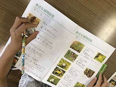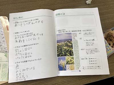 はじめに、こちらで用意した「身近な植物の写真シール」を台紙に貼って図鑑をつくりました。「身近な植物の写真シール」には「種名」「科名」「生育環境」「花期」などの情報も載せていますので、貼った写真について自分で解説文を書くことができます。