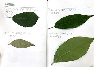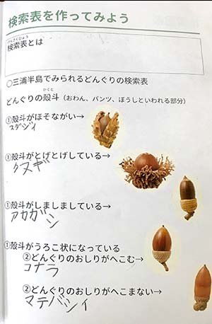 分類順に並べられている図鑑の中でも、『日本の野生植物(平凡社)』や『神奈川県植物誌(神奈川県立生命の星・地球博物館)』には種の同定の補助となる「検索表」があることを確認しました。検索表とは、生物種の同定の際に使用するもので、選択肢を選びながら種を絞り込んでいく表です。ここでは、実際の植物(どんぐりの果実と葉)を観察しながら検索表づくりに挑戦しました。まずは、既にできている検索文にあてはまるどんぐりを観察しながら選び、「どんぐりシール」を貼って検索表を完成させました。さらに、どんぐりの葉(押し葉)を観察しながら検索文を自分で考え、本物の葉を使った検索表をつくりました。
