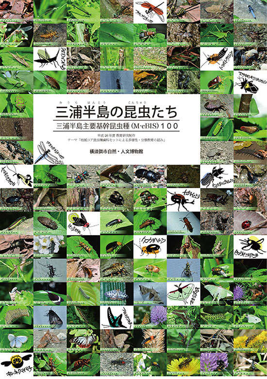 選定にあたっては、① 身近に観察できる(≒ 私の三浦半島各地における昆虫調査で目にする機会が多い)こと、② 昆虫の様々な分類群から抽出すること(こうした選定ではあまり取り上げられないイシノミ類やゴキブリ類なども加えました)、③ 各分類群の種数の多さ(≒ 多様性の高さ)を抽出数に反映させること、を基準としました。2014年にはポスター*を制作し、地域の多様な昆虫相を、具体的な100種の身近な昆虫によって紹介する試みを行いました(全国科学博物館活動等助成事業[平成26年度]による。写真参照)。この試みではまた、横須賀市の交流都市である会津若松市でも同じ基準で100種を選定して比較を行いましたが、2つの地域の間で異なる種が多く見られ、地域間の自然環境の違いを浮き彫りにできる可能性を感じました。