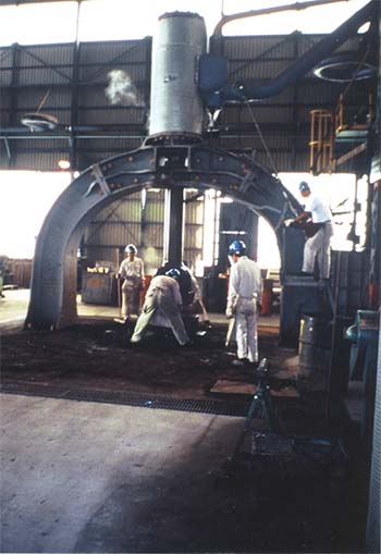 国指定重要文化財スチームハンマー(旧横須賀製鉄所設置)、3トン門形の稼動時の写真(平成8(1996)年8月22日撮影、在日米海軍横須賀基地内)