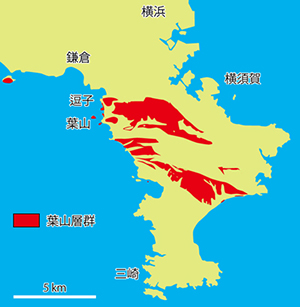 葉山層群は三浦半島の中部,葉山町~横須賀市衣笠周辺と,横須賀市秋谷~武山周辺に分布しています(図1)。海底で堆積した泥岩や砂岩,礫岩からなり,これらの岩石は三浦半島のほかの地層の岩石よりも緻密で固い特徴があります(図2)。微化石である放散虫化石や石灰質ナノ化石の研究から,約1,800万年前,または約1,500万年前につくられた地層であることがわかっていて,三浦半島では最も古い地層です。地層のズレである断層がたくさん見られ,地層が大きく変形したり,同じ地層が繰り返したりしていることが特徴です。このような地層の変形の様子などから,葉山層群はプレートが沈み込むときにつくられた付加体(図3)であると考えられています。また,葉山層群が分布する地域には,三浦枕状溶岩のような玄武岩(図4)や,蛇紋岩などの火成岩類が点在しています。これらの火成岩類は,かつての海洋プレートの断片であるオフィオライトと考えられています。これらの火成岩類は断層に沿って葉山層群に入り込んできたようです。葉山町や横須賀市では,火成岩類が見られるところは低地となっています。火成岩類が入り込んできた地層は,断層によってすりつぶされて周囲の地層よりも弱くなり,流水によって削られ,低地になったと考えられます(図5)。葉山町から横須賀市に続く道は,この断層由来と考えられます。