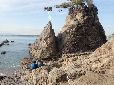 図2 葉山層群森戸層.葉山町森戸磯.砂岩と泥岩の互層からなる.断層がある場所は削られて凹んでいることがわかる.