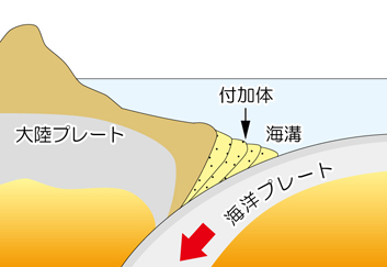 図3 模式的な付加体の断面.海洋プレートは海溝で大陸プレートと衝突し,地球の内部に沈み込む.沈み込めなかったプレートの断片やプレート上に堆積した地層の一部が,大陸にこすりつけられてできた地質体を付加体と呼ぶ.