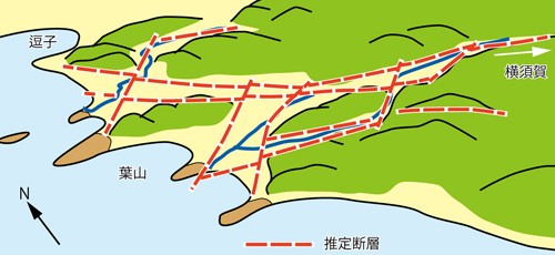 図5 葉山町の地形と推定される断層.断層の位置は『渡部ほか (1968) 神奈川県葉山地域の地質(1万分の1地質図説明書)』を参考とした.
