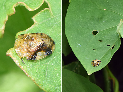 図2「ヨツモンカメノコハムシとノアサガオにできた食痕」