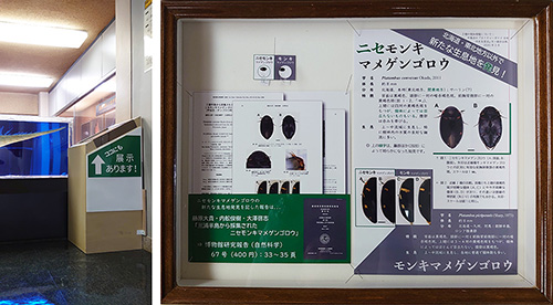 【ニセモンキマメゲンゴロウ】 体長6~8 mm程度の小さなゲンゴロウの仲間です。名前のとおり近縁種モンキマメゲンゴロウによく似ています。モンキマメゲンゴロウは、国内では各地の清流のよどみなどに生息する普通種である一方、ニセモンキマメゲンゴロウはこれまで北海道と東北地方しか生息が確認されていませんでした。2018年、三浦半島北部の鎌倉市で、モンキマメゲンゴロウと混生するニセモンキマメゲンゴロウが発見されました。この発見により、関東地方をはじめとする国内各地でニセモンキマメゲンゴロウの新産地発見の続報が期待されることとなりました。なお、博物館では2020年6月から、本館「めずらしい標本」コーナーの近くに、これら2種のゲンゴロウの標本を展示しています。ぜひご覧ください。