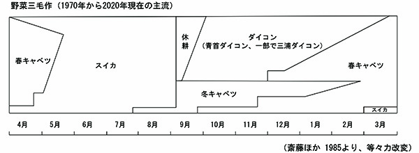 2018年現在での三浦半島の代表的農作物は、ダイコン(青首ダイコン)、早春キャベツ(収獲1-3月)、春キャベツ(収獲4-5月)、スイカ 、メロンがあげられます。1980年あたりからは、カボチャの栽培も盛んになってきました。この中で、三浦半島のダイコンの生産量は全国トップクラスです。しかし、そこに三浦ダイコンのしめる比率は、現在では0.5 %にまで落ち込んでいます。 三浦半島のダイコンは、三浦市高円坊のものが、優良品としてすでに江戸末期には知られていました。当時のダイコンは、根が鼠のしっぽに似た「鼠大根」と呼ばれるもので、現在の三浦ダイコンとは異なるものでした。 この後、明治38年(1905年)に鈴木寿一氏によって練馬ダイコンの種子が導入され、高円坊や小原といった地元のダイコンとの交雑・改良がおこなわれ、三浦ダイコンの形態の基礎ができてゆきました。大正14年(1925年)になると、岸亀蔵氏によって三浦産のダイコンは「三浦ダイコン」と命名され、ポスターやのぼりで大々的に宣伝。ブランドとして確立されてゆきました。 戦前より、ダイコンのできは畑への屎尿(しにょう)の量によるとされ、三浦半島の畑には大量の屎尿が投下されました。最初は横須賀まで農家さん自身が出向いて集めていましたが、戦後は横浜市の屎尿が運搬船によって三浦市まで運ばれるようになりました。現在の三浦半島の畑がよいのは、このときの屎尿の大量投与の影響であるといわれています。 1967年になると屎尿の使用禁止と牛馬数の減少で、農業形態が変化しました。これによって、現在みられるような春キャベツ―スイカ―ダイコンという野菜三毛作(図 2)が確立したのです。一方で、「オンバイモ」と呼ばれたジャガイモは、数を減らしました。