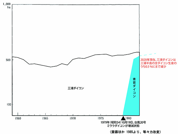 1979年10月19日、台風20号は三浦ダイコンを壊滅状態におとしいれました。代用として、関西を中心に栽培され、三浦ではほとんど見向きもされなかった青首ダイコンが、急遽まきなおされました。代用の青首ダイコンは無事に育って、出荷することができました。このとき農家さんは、収量が多く、労働の手間も少なく、高度成長期の社会のニーズにもマッチしていた青首ダイコンに一気に注目したのです。そして数年後には、三浦半島のダイコンの主流となって、現在にいたります(図 3)。