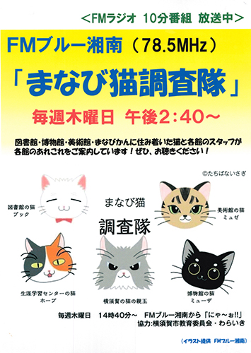 博物館のアイドル!?に、わんぱく黒猫のミューザがいます。チビ猫ミューザの夢は博物館でいろんなことを学んでビッグになること。もちろん、本当に猫が博物館を歩き回っているのではありません。FMブルー湘南で放送中の「まなび猫調査隊」(毎週木曜日14:40~約10分間、博物館紹介は第2木曜日)で、博物館の紹介をするオス猫ミューザが登場したのは、昨年4月のことでした。ミューザをご存じなかった方は、この機会にラジオを聞いて、ミューザのファンになっていただければと思います。