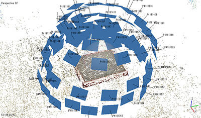 図1.解析されたカメラ位置と生成された3-D点群(ポイントクラウド).