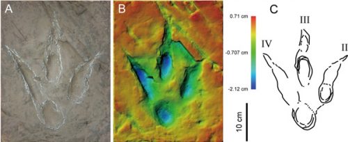 標本は肉食恐竜の足跡化石アジアノポダス.