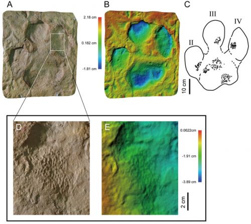 図4.皮膚の跡がある鳥脚類の足跡カリリクニウムのオルソモザイク画像 (A),深度マップ (B),スケッチ (C),ならびに拡大した皮膚の跡のオルソモザイク画像 (E) と深度マップ (E).