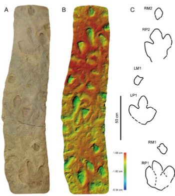 図5.カリリクニウムの歩行跡のオルソモザイク画像 (A),深度マップ (B),スケッチ (C).