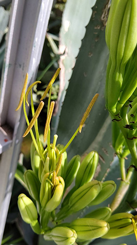 属名(Agave)の「アガベ」で呼ばれることもあるキジカクシ科(旧リュウゼツラン科)リュウゼツラン属の植物は、中米を中心に約300種が知られています。博物館付属の天神島臨海自然教育園には、耐寒性がある「アオノリュウゼツラン」が屋外で生育しています。アオノリュウゼツランはメキシコ原産で、現地では繊維や発酵酒の原料に利用されます。
