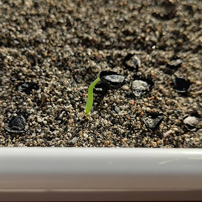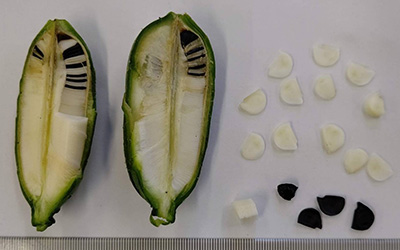 何十年もかけて繁殖のために1度だけ開花するリュウゼツランですが、自生地ではない天神島で咲いたアオノリュウゼツランは子孫を残すことができるのでしょうか。アオノリュウゼツランのポリネーター(花粉を運び、受粉に寄与する動物)は、コウモリであることが知られています。天神島のアオノリュウゼツランにどんな動物が訪れていたのかは観察できていませんが、8月末にはたくさんの果実をつけました。その後、台風接近に伴い9月末に果実を回収したところ、成熟していると思われる種子を50個以上確認できました。現在、30個の種子をまき、1個体だけ発芽しています。これは、自家受精(同じ個体の花粉によって受精する)によって種子ができたと考えられます。