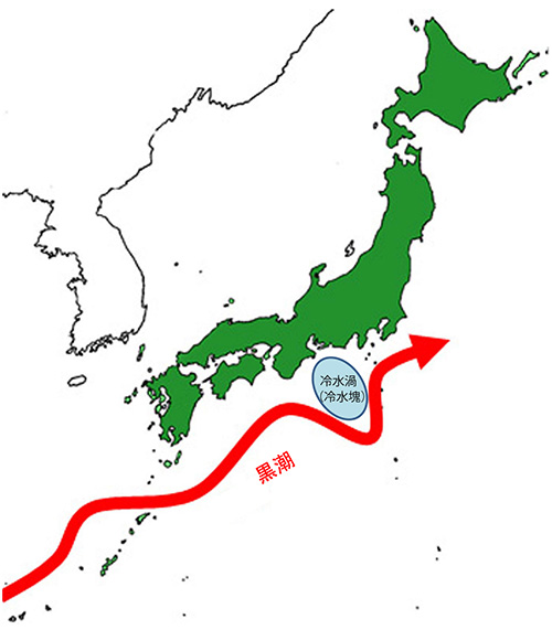 なぜ、紀伊半島沖に冷水渦が発生すると黒潮の大蛇行が起きるかというと、密度(温度)の異なる海水は混ざりにくく、南方から流れてくる暖かな流れ(暖流)の黒潮は、深層から湧き上った冷たい水の塊である冷水渦にぶつかると、これを迂回するように進路を変えます。その結果、黒潮は南側に大きく蛇行した流れとなってしまうのです。 黒潮が大蛇行すると、横須賀周辺の海にも大きな影響が現れます。顕著なのが相模湾や東京湾への黒潮の分流の侵入による海水温の上昇です。冷水塊をよけて一旦南下した黒潮はその後、関東地方に向けて急角度で北上し、関東地方に接する直前で東の房総半島沖へと進路変更するため、黒潮から枝分かれし、方向転換しきれなかった分流は横須賀の沿岸に向かってぶつかってくるような形になります。そのため横須賀周辺、特に黒潮の影響を受けやすい相模湾岸では水温の上昇が起きるのです。 また、黒潮は暖かな海水だけでなく、南方の暖かな海で生まれた生物の卵や浮遊幼生(生まれたばかりのプランクトン生活をする生物)も運んできます。これらの多くは通常、以前にこのメールマガジンでも紹介した「死滅回遊魚」として冬の寒さに耐えられずに死んでしまうのですが、黒潮の大蛇行が長期にわたると、これまであらわれなかった南方系の種類の生物が見つかったり、冬季の水温低下が緩くなり、死なずに冬を越してしまうものが出てきたりして、少しずつ生態系にも変化をもたらします。