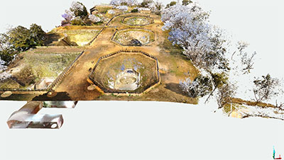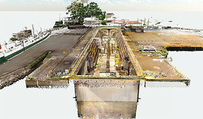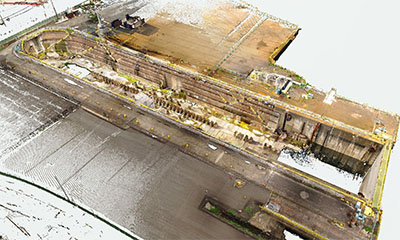 ドックと市街地との位置関係や高低差なども高精度で計測できます。このような広範囲な調査と記録保存にも有効。