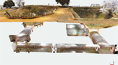 そのような中、横須賀市教育委員会では、3Dスキャンによる歴史的建造物の実測調査、ならびに再生・利活用の研究で実績を重ねてきた「関東学院大学建築環境学部黒田泰介研究室」の協力を得て、横須賀市内に現存する近代化遺産の3Dスキャンによる調査研究を進めてきました。この3Dスキャンによる調査は、大形の構造物、地下構造物を伴う砲台跡やドライドックなどの計測と記録作業で大きな力を発揮し、学術調査と研究に資する有益なデータをもたらしました。これら3Dスキャンによる学術調査の成果は、横須賀市教育委員会が発行する文化財調査報告書、学会の学術論文などで次々と発表されてきましたが、3Dスキャンの映像を広く伝える機会はなかなかありませんでした。横須賀市内の近代化遺産の3Dスキャンによる調査例もある程度の数量に達してきたのを契機に、横須賀市の近代化遺産の魅力を広く伝えることを目的として、トピックス展示「3Dスキャンで見る横須賀近代化遺産」を横須賀市自然・人文博物館、関東学院大学建築・環境学部 黒田泰介研究室、横須賀市教育委員会生涯学習課が共同で企画いたしました。