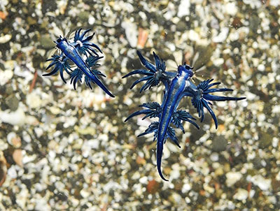 このとき、カツオノカンムリと一緒に海岸にやってきたのが英語名で「ブルードラゴン=青い龍」と呼ばれるアオミノウミウシでした。当博物館の付属天神島臨海自然教育園でも、5月初旬~中旬にかけて何度かアオミノウミウシの漂着が確認され、来園者からも注目されました。