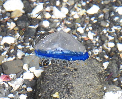 令和5(2023)年の春から初夏にかけて、三浦半島の相模湾沿岸にたくさんのカツオノカンムリというクラゲが漂着しました。このクラゲは強い毒を持つことで知られるカツオノエボシに近縁で、「群体性ヒドロクラゲ」と呼ばれる一群です。生活の仕方もカツオノエボシに似ていて、水に潜ることはなく、ふだんは外洋の海面にヨットの「帆」のような部分に風を受けて漂い、海流に乗って運ばれます。しかし、沖から岸に向かう強い風が吹くと、沿岸に吹き寄せられ、まれに海岸に打ちあげられることがあります。