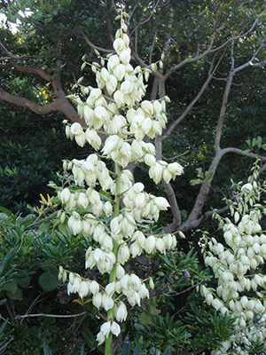 ユッカ(アツバキミガヨラン)が白い釣り鐘型の花をたわわにつけています。