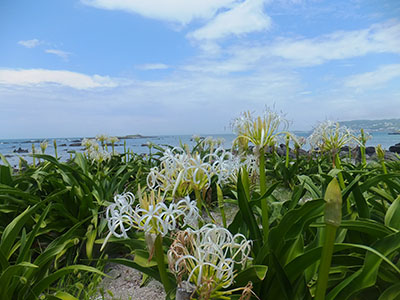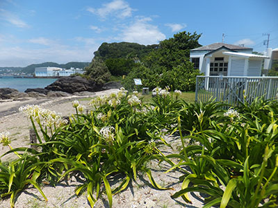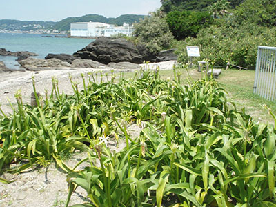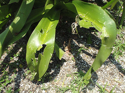 ハマオモトは6月下旬から咲き始め、7月上旬には見ごろになりましたが、7月18日、関東地方で大気が不安定になり各地で雹(ひょう)が観測された日に様子は一変。風と雹(ひょう)をまともに受けてしまった北口側のハマオモトが被害にあいました。雹(ひょう)が当たったとみられる葉は破け、茎は折れてしまいました。