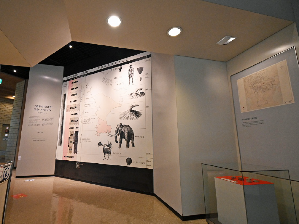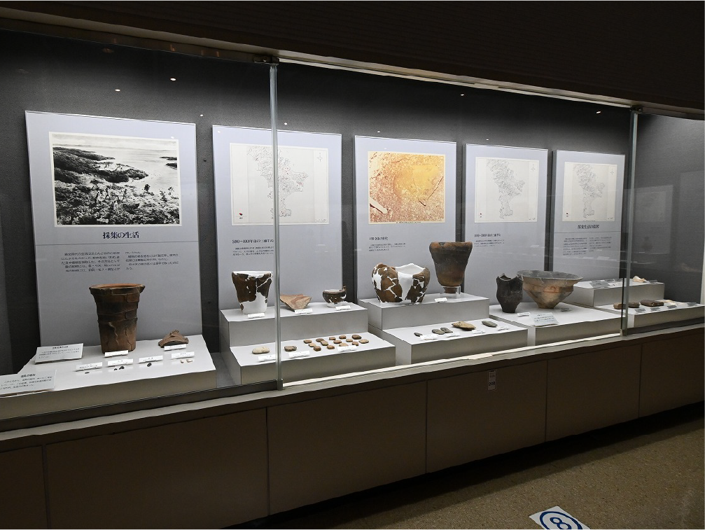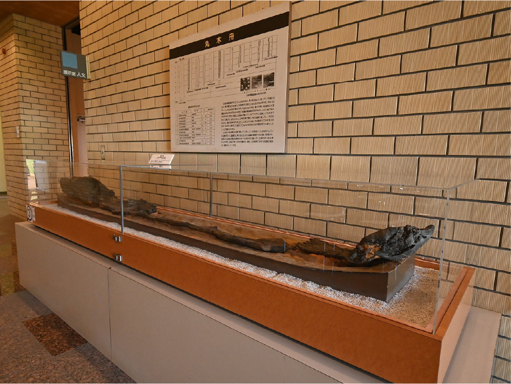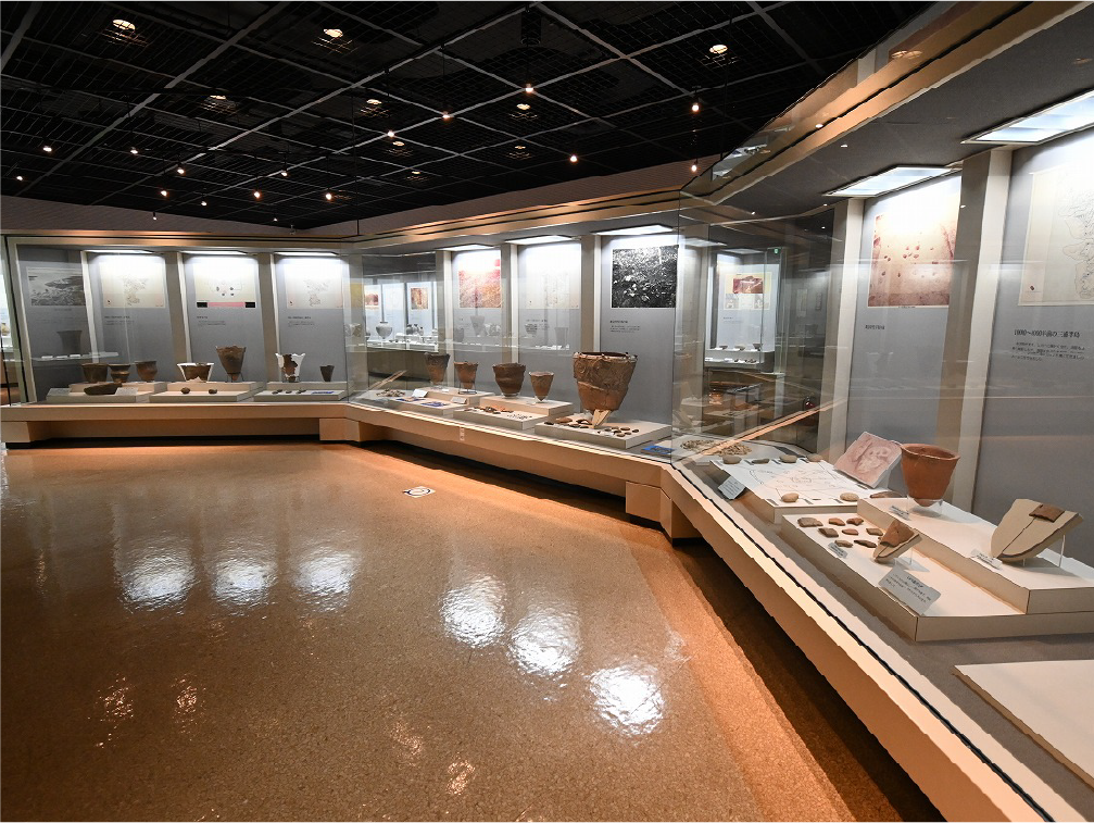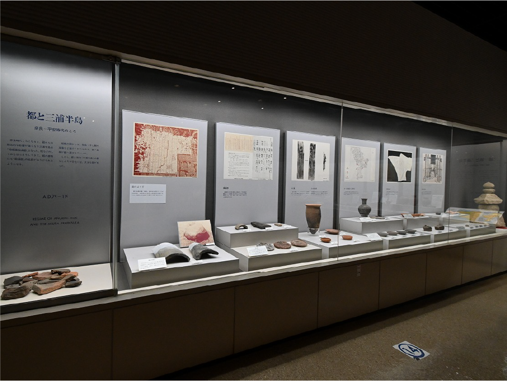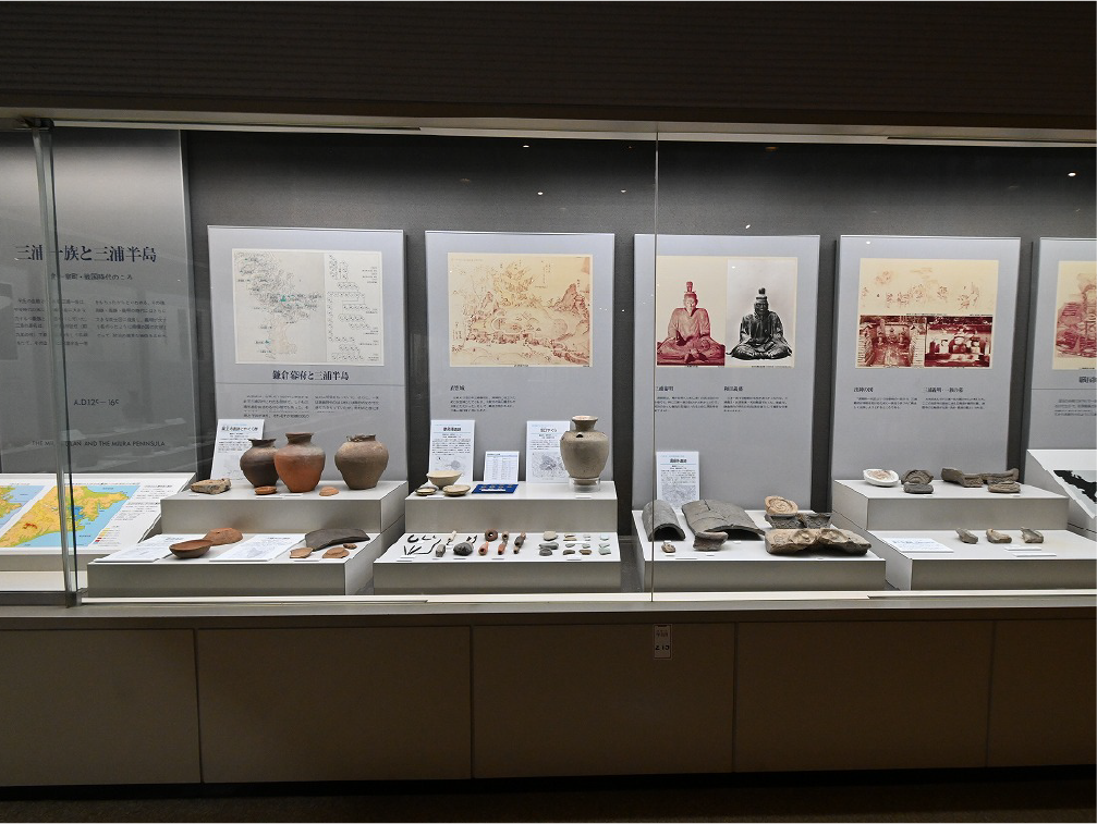 人文館 1階 トップページ>常設展示>人文館 1階 人文館 1階 旧石器・縄文・弥生・古墳時代、古代を経て中世の三浦一族が栄えたころまでの歴史を紹介しています。おもに三浦半島から出土した土器や骨角器・埴輪などを展示しています。三浦半島の海辺での生活を再現したジオラマや古墳時代の住居の模型などからは昔の人々のくらしぶりを想像することができます。 三浦半島を作る地層 縄文時代の丸木舟 三浦半島にヒトが住み着いたころ 採集の時代Ⅰ 採集の時代Ⅱ 海の生活 海の生活 農耕の始まり 豪族の誕生 都と三浦半島 三浦一族と三浦半島 詳細一覧 三浦半島をつくる地層 約10万年前以降、三浦半島では箱根などの火山から噴出した火山灰が降り積もり、関東ローム層となりました。このコーナーでは三浦半島南部で作成した、高さ8mの関東ローム層のはぎ取り標本を展示しています。 縄文時代の丸木舟 横須賀市久里浜9丁目伝福寺裏遺跡(でんぷくじうらいせき)から出土した縄文時代前期末葉~中期初頭頃の丸木舟です。ムクノキ製で、現存長304.0㎝と国内最小クラスです。その規模から、沿岸での漁撈活動(ぎょろうかつどう)に使われていたものと考えられています。 また、同遺跡には東北南部から畿内地方までにおよぶ広範囲の土器が運び込まれていることが確認されています。 三浦半島にヒトが住み着いたころ 三浦半島に人が住み始めたのは土器の出現より10,000 年以上も前の、26,000 年前頃と考えられています。しかし、旧石器時代の遺跡数は少ないことから、その後もあまり人口は増加しなかったようです。このコーナーでは、各遺跡から出土した石器のほか、地層や自然環境の変化などを含めたパネルを展示しています。 採集の時代Ⅰ 縄文時代早期の三浦半島は自然環境に恵まれた地域であったらしく、全国屈指の遺跡密度を誇ります。特に貝塚は多く、海からの恵みが豊かな暮らしを 支えていたことがうかがえます。 しかし、温暖化にともない海水面の上昇がピークを迎える前期には遺跡数が激減することから、生活環境は大きく変化したことがわかります。 このコーナーでは、早期の豊富な土器・石器・骨角器( こっかくき) 類を展示するとともに、縄文土器に直接触ることができる体験コーナーもあります。 採集の時代Ⅱ 東日本では、沿岸部・内陸部にかかわらず中期になると遺跡の規模・数ともに爆発的に増加し最盛期を迎えます。三浦半島ではこの時期、東北南部から近畿地方におよぶ広範囲の地域から土器が運び込まれるなど活発な交流があったことが知られています。しかし爆発的な人口増加は認められず、後期以降急速に遺跡数は減り、晩期にはほとんど人は暮らしていなかったようです。 このコーナーでは各期の土器のほか、漁撈道具(ぎょろうどうぐ)である土器片錘(どきへんすい)や貝刃(かいじん)、貝・牙などで作られた装身具などを展示しています。 海の生活 伝福寺裏遺跡(でんぷくじうらいせき)出土の骨角器(こっかくき)や魚骨・貝などをもとに、縄文時代中期初頭(約5,000年前)の磯での漁撈活動を再現したジオラマです。当時のひとびとは裸ではありませんが、正確な服装が不明なためあえて着せていません。 農耕のはじまり 三浦半島に弥生文化が伝えられたのは中期中葉頃で、集落を形成し本格的に稲作が開始されるのは中期後葉頃のようです。後期には遺跡数も爆発的に増加しますが、終末期には東海以西の古墳時代の土器が運び込まれています。これは、三浦半島が弥生時代の終末期であったころ、東海以西ではすでに古墳時代となっていたことを意味しています。 このコーナーでは、土器・石器・炭化米のほか、当時の拠点的集落のひとつであった鴨居上の台遺跡(かもいうえのだいいせき)の立体地模型や集落の変遷図なども展示しています。 豪族の誕生 前期(3~4世紀)・中期(5世紀)には東海以西の、後期以降(6~7世紀)は埼玉県・群馬県など関東地方内陸部の土器が海浜部の遺跡から多量に出土するようになります。これは、三浦半島が古墳時代をとおして海上交通の要衝である港として使われていたことを示しています。 また、三浦半島では土を高く盛り上げた古墳は少なく、崖に穴を掘り墓とした横穴墓(おうけつぼ)が多数みられますが、古墳には埼玉県や群馬県の埴輪(はにわ)が立てられたり、副葬品(ふくそうひん)に東海地方の土器がみられるなど、各地との交流の深さがわかります。 このコーナーでは、弾琴男子椅座像など古墳に立てられた埴輪や、装身具・武器・土器などの副葬品を展示しています。また、土師器(はじき)・須恵器(すえき)など古墳時代の土器に直接触ることができる体験コーナーもあります。 都と三浦半島 奈良・平安時代には、三浦半島にも律令体制(りつりょうたいせい)がしかれました。御浦郡(みうらぐん)とよばれた役所には、御浦郡司代大田部直圀成(みうらぐんじだいおおたべのあたいくになり)という役人もいました。寺院や役所には都と同じ屋