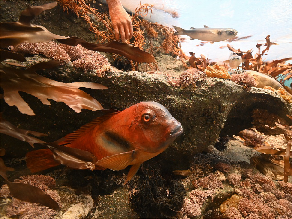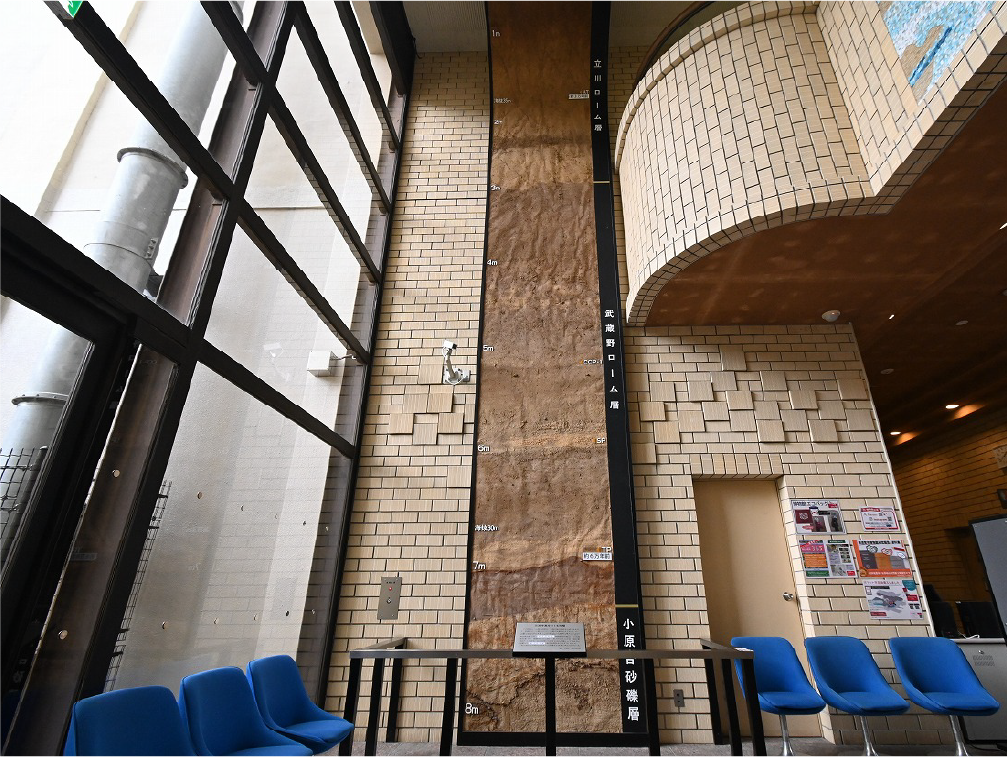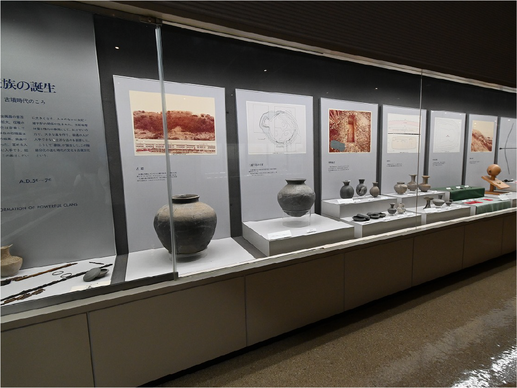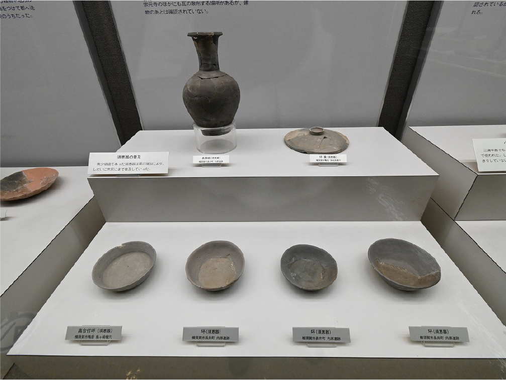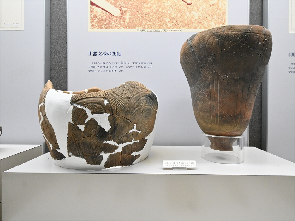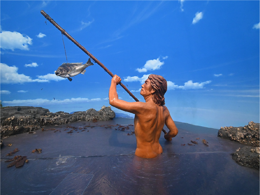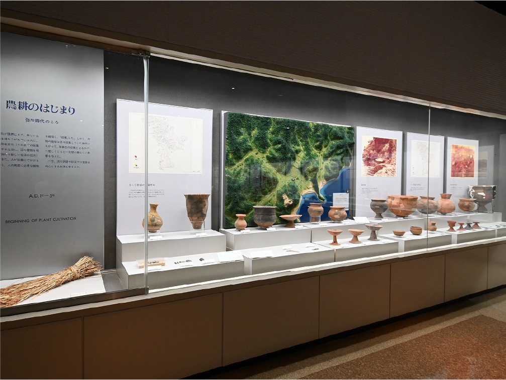 人文館 1階 トップページ>常設展示>人文館 1階 人文館 1階 旧石器・縄文・弥生・古墳時代、古代を経て中世の三浦一族が栄えたころまでの歴史を紹介しています。おもに三浦半島から出土した土器や骨角器・埴輪などを展示しています。三浦半島の海辺での生活を再現したジオラマや古墳時代の住居の模型などからは昔の人々のくらしぶりを想像することができます。 三浦半島を作る地層 縄文時代の丸木舟 三浦半島にヒトが住み着いたころ 採集の時代Ⅰ 採集の時代Ⅱ 海の生活 海の生活 農耕の始まり 豪族の誕生 都と三浦半島 三浦一族と三浦半島 詳細一覧 三浦半島をつくる地層 約10万年前以降、三浦半島では箱根などの火山から噴出した火山灰が降り積もり、関東ローム層となりました。このコーナーでは三浦半島南部で作成した、高さ8mの関東ローム層のはぎ取り標本を展示しています。 縄文時代の丸木舟 横須賀市久里浜9丁目伝福寺裏遺跡(でんぷくじうらいせき)から出土した縄文時代前期末葉~中期初頭頃の丸木舟です。ムクノキ製で、現存長304.0㎝と国内最小クラスです。その規模から、沿岸での漁撈活動(ぎょろうかつどう)に使われていたものと考えられています。 また、同遺跡には東北南部から畿内地方までにおよぶ広範囲の土器が運び込まれていることが確認されています。 三浦半島にヒトが住み着いたころ 三浦半島に人が住み始めたのは土器の出現より10,000 年以上も前の、26,000 年前頃と考えられています。しかし、旧石器時代の遺跡数は少ないことから、その後もあまり人口は増加しなかったようです。このコーナーでは、各遺跡から出土した石器のほか、地層や自然環境の変化などを含めたパネルを展示しています。 採集の時代Ⅰ 縄文時代早期の三浦半島は自然環境に恵まれた地域であったらしく、全国屈指の遺跡密度を誇ります。特に貝塚は多く、海からの恵みが豊かな暮らしを 支えていたことがうかがえます。 しかし、温暖化にともない海水面の上昇がピークを迎える前期には遺跡数が激減することから、生活環境は大きく変化したことがわかります。 このコーナーでは、早期の豊富な土器・石器・骨角器( こっかくき) 類を展示するとともに、縄文土器に直接触ることができる体験コーナーもあります。 採集の時代Ⅱ 東日本では、沿岸部・内陸部にかかわらず中期になると遺跡の規模・数ともに爆発的に増加し最盛期を迎えます。三浦半島ではこの時期、東北南部から近畿地方におよぶ広範囲の地域から土器が運び込まれるなど活発な交流があったことが知られています。しかし爆発的な人口増加は認められず、後期以降急速に遺跡数は減り、晩期にはほとんど人は暮らしていなかったようです。 このコーナーでは各期の土器のほか、漁撈道具(ぎょろうどうぐ)である土器片錘(どきへんすい)や貝刃(かいじん)、貝・牙などで作られた装身具などを展示しています。 海の生活 伝福寺裏遺跡(でんぷくじうらいせき)出土の骨角器(こっかくき)や魚骨・貝などをもとに、縄文時代中期初頭(約5,000年前)の磯での漁撈活動を再現したジオラマです。当時のひとびとは裸ではありませんが、正確な服装が不明なためあえて着せていません。 農耕のはじまり 三浦半島に弥生文化が伝えられたのは中期中葉頃で、集落を形成し本格的に稲作が開始されるのは中期後葉頃のようです。後期には遺跡数も爆発的に増加しますが、終末期には東海以西の古墳時代の土器が運び込まれています。これは、三浦半島が弥生時代の終末期であったころ、東海以西ではすでに古墳時代となっていたことを意味しています。 このコーナーでは、土器・石器・炭化米のほか、当時の拠点的集落のひとつであった鴨居上の台遺跡(かもいうえのだいいせき)の立体地模型や集落の変遷図なども展示しています。 豪族の誕生 前期(3~4世紀)・中期(5世紀)には東海以西の、後期以降(6~7世紀)は埼玉県・群馬県など関東地方内陸部の土器が海浜部の遺跡から多量に出土するようになります。これは、三浦半島が古墳時代をとおして海上交通の要衝である港として使われていたことを示しています。 また、三浦半島では土を高く盛り上げた古墳は少なく、崖に穴を掘り墓とした横穴墓(おうけつぼ)が多数みられますが、古墳には埼玉県や群馬県の埴輪(はにわ)が立てられたり、副葬品(ふくそうひん)に東海地方の土器がみられるなど、各地との交流の深さがわかります。 このコーナーでは、弾琴男子椅座像など古墳に立てられた埴輪や、装身具・武器・土器などの副葬品を展示しています。また、土師器(はじき)・須恵器(すえき)など古墳時代の土器に直接触ることができる体験コーナーもあります。 都と三浦半島 奈良・平安時代には、三浦半島にも律令体制(りつりょうたいせい)がしかれました。御浦郡(みうらぐん)とよばれた役所には、御浦郡司代大田部直圀成(みうらぐんじだいおおたべのあたいくになり)という役人もいました。寺院や役所には都と同じ屋