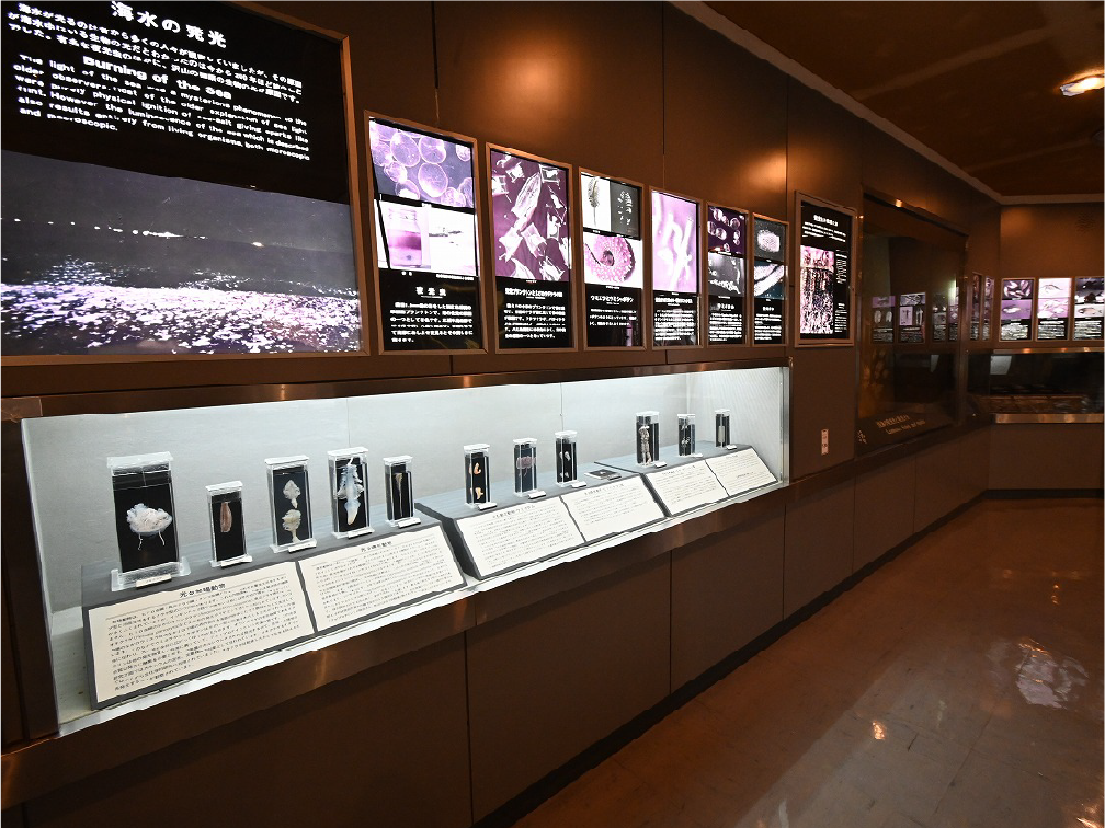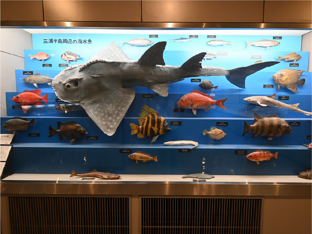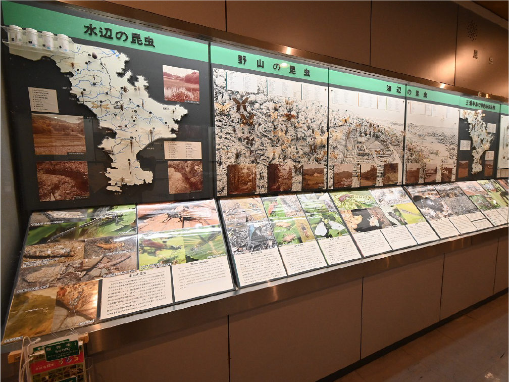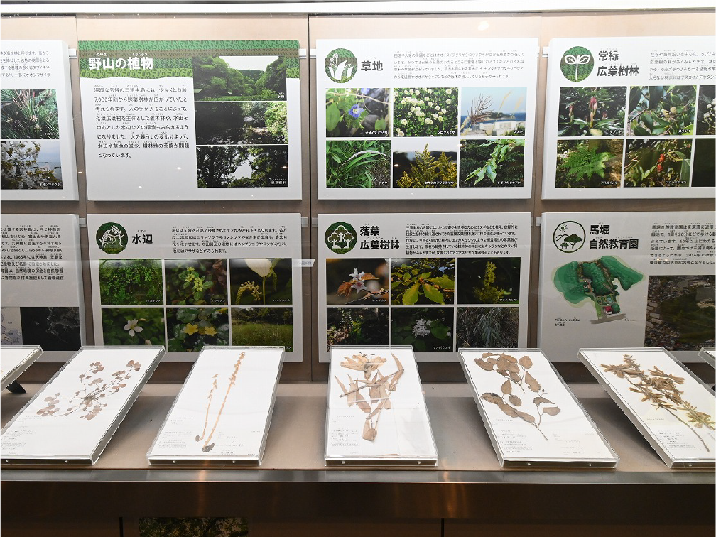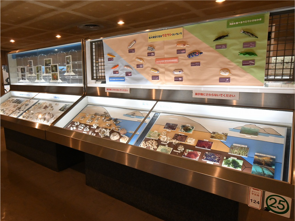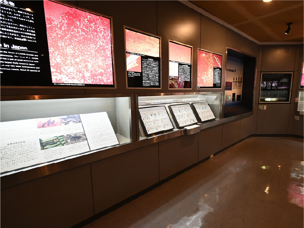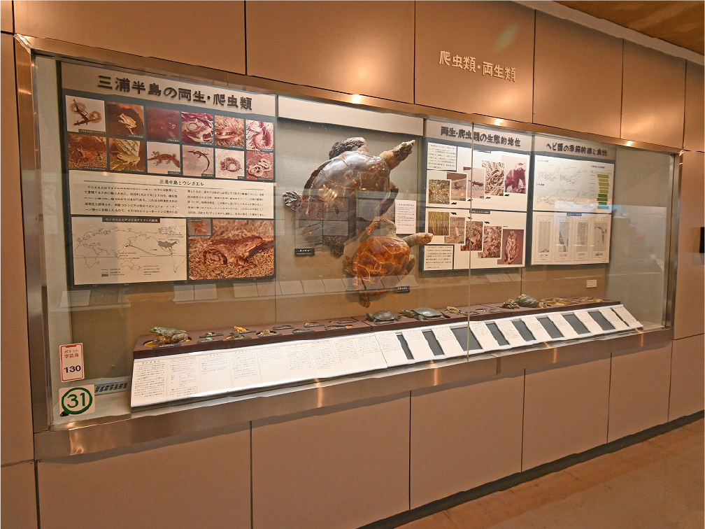 自然館 1階 トップページ>常設展示>自然館 1階 自然館 1階 おもに三浦半島の生き物を紹介しています。「植物」、「昆虫」、「海辺の生物」、「魚類」、「鳥類」、「哺乳類」などの展示があります。地質時代の化石を展示した「生命の歴史」、大型の鉱物を展示した「美しい石」もあります。ホタルやホタルイカなどの「発光生物」の展示は、当館の展示の特色です。 岩石壁面 生命の歴史 美しい石 植物 海の生物 三浦半島の哺乳類 三浦半島の哺乳類 魚類 鳥類 両生・は虫類 有毒・有害な生物 昆虫類 陸の発光生物 海の発光生物 深海の生物 詳細一覧 岩石壁面 私たちの身の回りには、さまざまな岩石が石材として使われています。2階から1階への階段の壁面には、大谷石 (おおやいし) や浮金石 (うきがねいし) などの石材が、装飾を兼ねて展示されています。 生命の歴史 約46億年の地球の歴史の中で、多様な生物が出現したのは古生代 (約5億4,000万~2億5,000万年前) になってからです。古生代には三葉虫や魚類が栄えました。中生代 (約2億5000万~6500万年前) にはアンモナイトや恐竜を代表とするは虫類が栄え、新生代 (約6500万年前~現在) になると哺乳類と被子植物が繁栄しました。 このコーナーでは古生代の三葉虫やフズリナ (有孔虫)、中生代のアンモナイトや首長竜 (エラスモサウルス類)、新生代のデスモスチルス (哺乳類) など、地質時代を代表する化石を展示しています。 美しい石 岩石をつくる鉱物のうち、形や色がきれいなものは宝石として用いられることもあります。 このコーナーでは紫水晶や黄鉄鉱、メノウなど、美しい鉱物を展示しています。 植物 三浦半島の野生植物は、1700~1800種類ほどで、森林の植物と海岸の植物にその地域的な特色がもっともよく表れています。森林植物は馬堀自然教育園で、海岸の植物は天神島臨海自然教育園でいつでも見ることができます。 特にフウトウカズラ、ハマボウ、ワダン、タシロランは三浦半島の照葉樹林や海岸に生育する代表的な植物です。 森の植物として、ミズキ、ヤアツツジ、ミヤマウズラなどの生態写真、ヤブコウジ、クサギなどの標本、海岸の植物としてハマカンゾウ、スカシユリなどの生態写真、ハママツナ、ホソバノハマアカザ、コウボウムギなどの標本が展示されています。中央には113種の植物画が波打ち際から山頂までの植物相の変化を表現しています。 海の生物 磯や干潟には、イソギンチャクやサンゴなどの刺胞動物、エビやカニなどの節足動物、巻貝や二枚貝などの軟体動物、ウニやヒトデなどの棘皮動物など多様な動物が生息し、海藻や海草などの植物も生育しています。これらの生き物を見られる環境や水深ごとに標本や写真で紹介しています。 また、相模湾で見られる美しいウミウシ類の生態写真も展示しています。 三浦半島の哺乳類 現在の三浦半島には大型の野生哺乳類は分布していないため、展示はホンドタヌキ、キュウシュウノウサギ、ネズミ類、コウモリ類など、中・小型の哺乳類のはく製標本が中心となっています。また、近年急速に生息数を増やしている外来生物のアライグマとタイワンリスのはく製標本や、間違えやすいアライグマとタヌキの見分け方も紹介しています。 魚類 三浦半島は東京湾と相模湾の異なった環境の海にはさまれ、たくさんの魚が見られます。 このコーナーでは、めずらしいシノノメサカタザメをはじめ、マダイ、ブリ、スズキなど身近な魚、サザナミヤッコ、テングダイ、カゴカキダイなど美しい魚などのはく製標本をご覧いただけるほか、三浦半島の外来魚の写真、古代魚シーラカンスのレプリカなども展示しています。 鳥類 三浦半島では一年中見られる鳥(留鳥)のほか、季節によって飛来する渡り鳥が見られます。 このコーナーでは、城ケ島の集団越冬地が県の天然記念物に指定されているウミウ、ヒメウや、身近に見られるハシブトガラス、ハシボソガラス、ヒヨドリ、コサギなどを常設でご覧いただくほか、四季折々に見られる鳥を季節に合わせて入れ替えています。 両生・は虫類 両生類はカエル、イモリ、サンショウウオなどのなかま、は虫類はヘビ、トカゲ、カメなどのなかまです。三浦半島の両生・は虫類には数が減ってしまった種が多く、トウキョウダルマガエルは姿を消し、イモリ、トウキョウサンショウウオ、ウミガメ類なども絶滅の危機にあります。このコーナーでは、はく製標本とレプリカで両生・は虫類を紹介しています。 有毒・有害な生物 野外で自然に親しみ、動植物の観察や景観を観賞することは、心や体に活気を取り戻してくれる楽しい時間です。しかし、自然は人間だけのものではありません。多種多様な動植物が暮らしています。中にはヒトを有害な敵とみなしておそってくることもあります。人間がうっかり触ったり、巣を壊したり、近づきすぎたりると、思わぬ攻撃にあい、刺されたり、かまれたりします。このコーナーでは三浦半島で出あう可能性の高い、そ