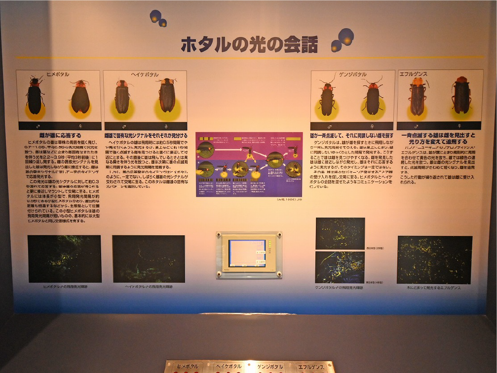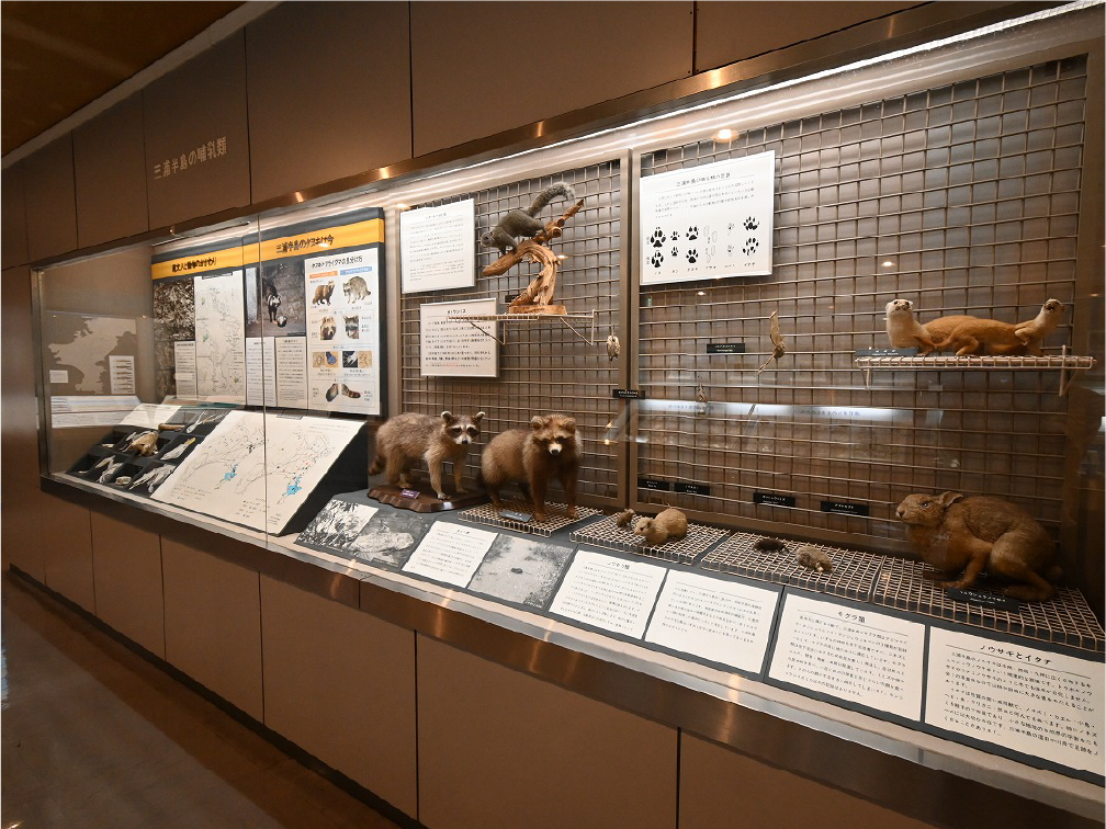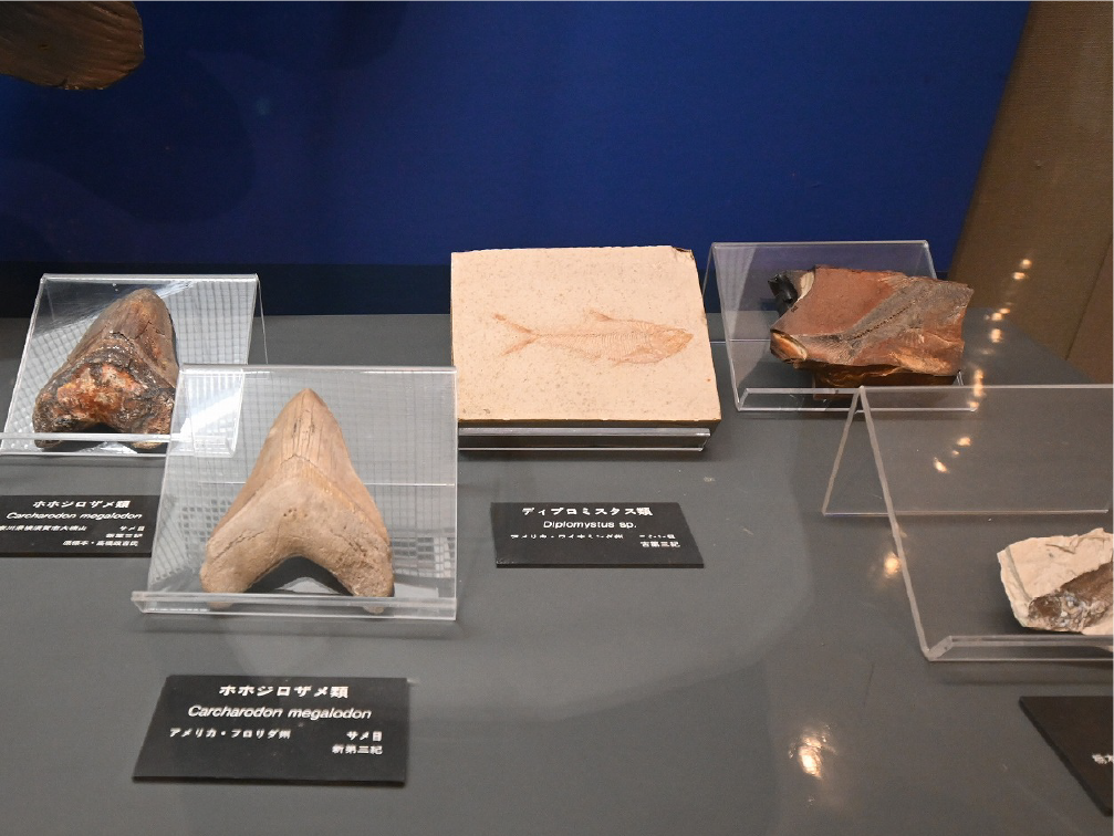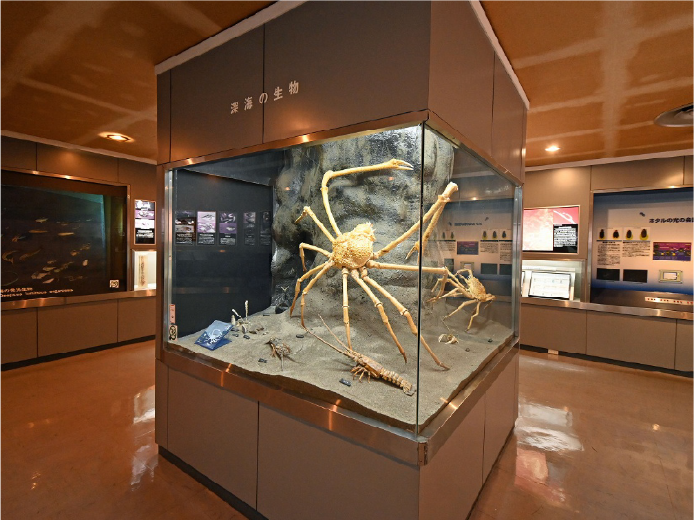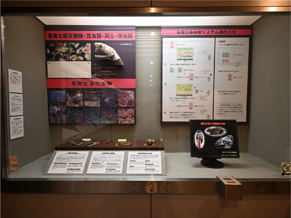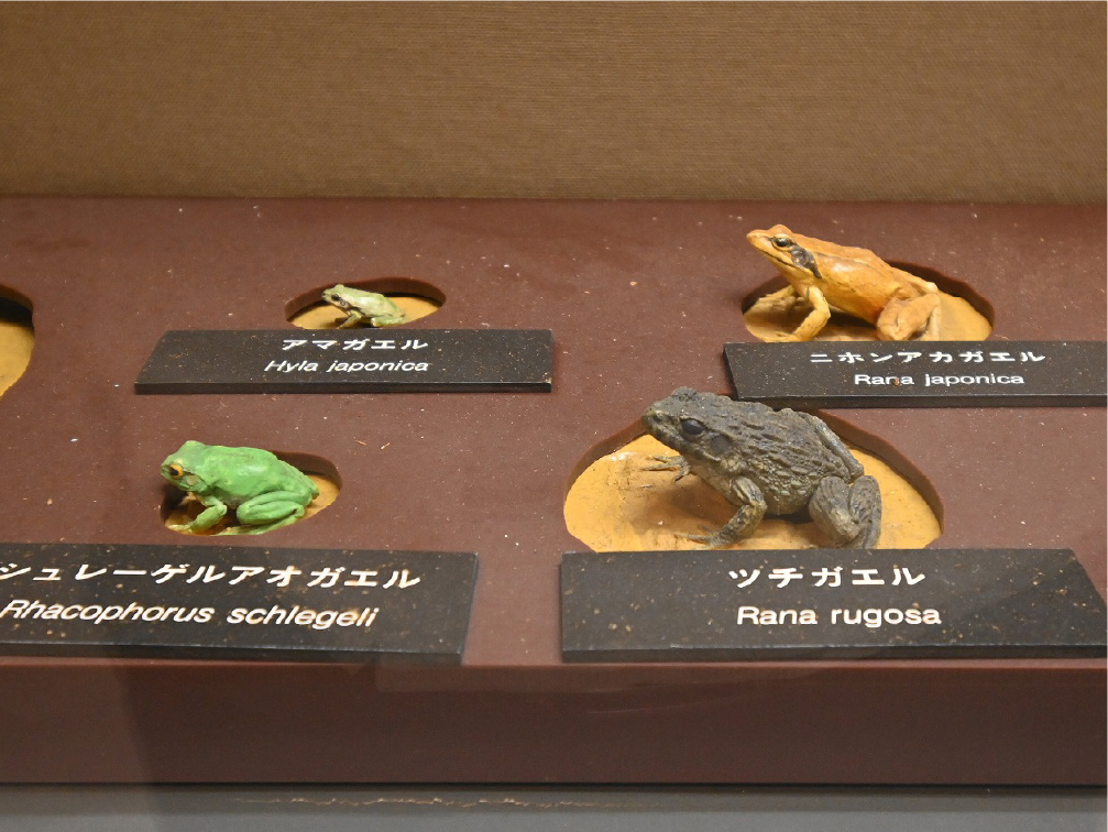 自然館 1階 トップページ>常設展示>自然館 1階 自然館 1階 おもに三浦半島の生き物を紹介しています。「植物」、「昆虫」、「海辺の生物」、「魚類」、「鳥類」、「哺乳類」などの展示があります。地質時代の化石を展示した「生命の歴史」、大型の鉱物を展示した「美しい石」もあります。ホタルやホタルイカなどの「発光生物」の展示は、当館の展示の特色です。 岩石壁面 生命の歴史 美しい石 植物 海の生物 三浦半島の哺乳類 三浦半島の哺乳類 魚類 鳥類 両生・は虫類 有毒・有害な生物 昆虫類 陸の発光生物 海の発光生物 深海の生物 詳細一覧 岩石壁面 私たちの身の回りには、さまざまな岩石が石材として使われています。2階から1階への階段の壁面には、大谷石 (おおやいし) や浮金石 (うきがねいし) などの石材が、装飾を兼ねて展示されています。 生命の歴史 約46億年の地球の歴史の中で、多様な生物が出現したのは古生代 (約5億4,000万~2億5,000万年前) になってからです。古生代には三葉虫や魚類が栄えました。中生代 (約2億5000万~6500万年前) にはアンモナイトや恐竜を代表とするは虫類が栄え、新生代 (約6500万年前~現在) になると哺乳類と被子植物が繁栄しました。 このコーナーでは古生代の三葉虫やフズリナ (有孔虫)、中生代のアンモナイトや首長竜 (エラスモサウルス類)、新生代のデスモスチルス (哺乳類) など、地質時代を代表する化石を展示しています。 美しい石 岩石をつくる鉱物のうち、形や色がきれいなものは宝石として用いられることもあります。 このコーナーでは紫水晶や黄鉄鉱、メノウなど、美しい鉱物を展示しています。 植物 三浦半島の野生植物は、1700~1800種類ほどで、森林の植物と海岸の植物にその地域的な特色がもっともよく表れています。森林植物は馬堀自然教育園で、海岸の植物は天神島臨海自然教育園でいつでも見ることができます。 特にフウトウカズラ、ハマボウ、ワダン、タシロランは三浦半島の照葉樹林や海岸に生育する代表的な植物です。 森の植物として、ミズキ、ヤアツツジ、ミヤマウズラなどの生態写真、ヤブコウジ、クサギなどの標本、海岸の植物としてハマカンゾウ、スカシユリなどの生態写真、ハママツナ、ホソバノハマアカザ、コウボウムギなどの標本が展示されています。中央には113種の植物画が波打ち際から山頂までの植物相の変化を表現しています。 海の生物 磯や干潟には、イソギンチャクやサンゴなどの刺胞動物、エビやカニなどの節足動物、巻貝や二枚貝などの軟体動物、ウニやヒトデなどの棘皮動物など多様な動物が生息し、海藻や海草などの植物も生育しています。これらの生き物を見られる環境や水深ごとに標本や写真で紹介しています。 また、相模湾で見られる美しいウミウシ類の生態写真も展示しています。 三浦半島の哺乳類 現在の三浦半島には大型の野生哺乳類は分布していないため、展示はホンドタヌキ、キュウシュウノウサギ、ネズミ類、コウモリ類など、中・小型の哺乳類のはく製標本が中心となっています。また、近年急速に生息数を増やしている外来生物のアライグマとタイワンリスのはく製標本や、間違えやすいアライグマとタヌキの見分け方も紹介しています。 魚類 三浦半島は東京湾と相模湾の異なった環境の海にはさまれ、たくさんの魚が見られます。 このコーナーでは、めずらしいシノノメサカタザメをはじめ、マダイ、ブリ、スズキなど身近な魚、サザナミヤッコ、テングダイ、カゴカキダイなど美しい魚などのはく製標本をご覧いただけるほか、三浦半島の外来魚の写真、古代魚シーラカンスのレプリカなども展示しています。 鳥類 三浦半島では一年中見られる鳥(留鳥)のほか、季節によって飛来する渡り鳥が見られます。 このコーナーでは、城ケ島の集団越冬地が県の天然記念物に指定されているウミウ、ヒメウや、身近に見られるハシブトガラス、ハシボソガラス、ヒヨドリ、コサギなどを常設でご覧いただくほか、四季折々に見られる鳥を季節に合わせて入れ替えています。 両生・は虫類 両生類はカエル、イモリ、サンショウウオなどのなかま、は虫類はヘビ、トカゲ、カメなどのなかまです。三浦半島の両生・は虫類には数が減ってしまった種が多く、トウキョウダルマガエルは姿を消し、イモリ、トウキョウサンショウウオ、ウミガメ類なども絶滅の危機にあります。このコーナーでは、はく製標本とレプリカで両生・は虫類を紹介しています。 有毒・有害な生物 野外で自然に親しみ、動植物の観察や景観を観賞することは、心や体に活気を取り戻してくれる楽しい時間です。しかし、自然は人間だけのものではありません。多種多様な動植物が暮らしています。中にはヒトを有害な敵とみなしておそってくることもあります。人間がうっかり触ったり、巣を壊したり、近づきすぎたりると、思わぬ攻撃にあい、刺されたり、かまれたりします。このコーナーでは三浦半島で出あう可能性の高い、そ