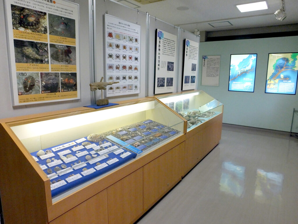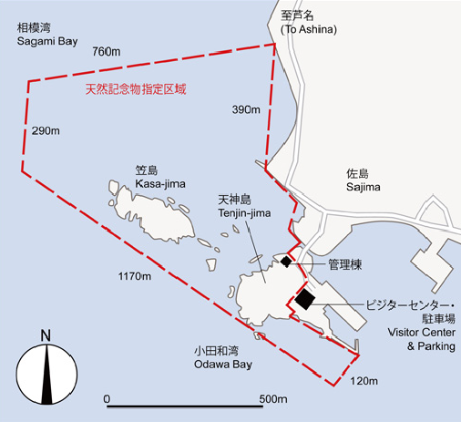 天神島臨海自然教育園 トップページ>付属施設>天神島臨海自然教育園 天神島臨海自然教育園 概要 相模湾に面した三浦半島の西海岸にあり、三浦半島の代表的な海岸の自然環境を保護しています。江の島、丹沢山地をはじめ、箱根や富士山、伊豆半島の山並み、伊豆大島などを一望できる景勝地で、ハマオモト(ハマユウ)群落の一部が1953年に自然分布の北限地として神奈川県の天然記念物に指定され、1965年には天神島・笠島及び周辺海域(54万㎡)が神奈川県の天然記念物及び名勝に指定されました。 天神島臨海自然教育園の園内マップ 天神島臨海自然教育園の全景 園内の見どころ 岩礁はおよそ500万年前に海底でつくられた地層からできており、地層の観察に適しています。巨大噴火が起こったことを示す火山豆石や、地層のずれである断層などを観察できます。 火山豆石 砂浜にはハマオモト(ハマユウ)、ハマボウ、スカシユリ、タイトゴメ、テリハノイバラなどの海岸植物が見られます。周囲の磯には100種ほどの海藻、砂泥底にはアマモやタチアマモなどの海草が生育しています。 ハマオモト スカシユリ タイトゴメ 園内は岩礁や転石地、砂泥底など環境が多様で、チョウチョウウオ類など暖海性の種を含んだ約250種の魚類、ウミウシ類を含めた約200種の軟体動物、エビやカニなど約100種の甲殻類、ウニやヒトデなど約40種の棘皮動物など多様な海洋動物を観察できます。 トゲチョウチョウウオ シロウミウシ ウミネコやウミウなどの海鳥、ツグミやムクドリなど里山の鳥のほか、シギ類のような旅鳥など、約80種の野鳥も見られます。 ウミネコ ウミウ 海岸には肉食性のヒョウタンゴミムシが現れ、ハマオモトを食草とするハマオモトヨトウも見られます。草地や林内では三浦半島で一般的に見られる昆虫類が飛来・生息し,これまでに約150種が記録されています。 ヒョウタンゴミムシ ハマオモトヨトウ(成虫) ハマオモトヨトウ(幼虫) 天神島ビジターセンター 自然環境学習や海岸・海洋生物、海岸地形などの研究の拠点なる施設です。展示室・講座室・学習室などがあります。展示室では航空写真による天神島とその周辺地域の様子、相模湾の魚類のはくせい、天神島周辺の歴史や年中行事、見突き漁(みつきりょう)の道具・定置網(ていちあみ)などを展示しています。自然観察の方法・マナーなども紹介しています。 天神島ビジターセンター ホール 第1展示室 第2展示室 教育園の利用について 教育園は、自然観察と自然環境の保護、調査研究など教育的利用を目的としています。園内での次の行為はお断りします。また、ゴミは持ち帰り願います。 「笠島」に無断で上陸すること 漁業権者以外の者が釣竿・モリ・網等の採集用具を持って入園すること 遊泳すること、許可なく潜水行為をすること 園内や天然記念物指定区域内の動物・植物・海藻・岩石などを許可なく採集すること 天然記念物指定区域内でボード・帆走遊具・カヌー・ヨット・小型船舶の使用、 停泊をすること レジャー用具や火気を使用すること 飲酒・喫煙すること、ペットを持ち込むこと 無断で商業用の撮影・行為をすること 教育園の保全・管理・運営のさまたげになる行為をすること 馬堀自然教育園は横須賀市の文化財(天然記念物)に指定されています。動植物や景観を将来に残すため、ご理解とご協力をお願いします。 天然記念物指定区域 天神島臨海自然教育園の アクセスはこちら 天神島臨海自然教育園アクセス 「 駐車整理券」の発行について はこちら 駐車場整理券の発行について